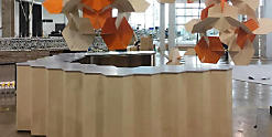 The eye-catching curved LDF information desk is made from sections of ultra-versatile Corian®, which has been machined into a specially designed finish created by Giles Miller Studio, renowned for a fascination with the manipulation of light and reflection in surfaces.