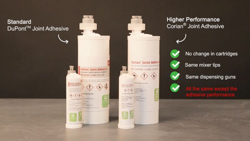 Obwohl der Name nun Corian® Joint Adhesive lautet, ist dieser Kleber für alle Anwendungen empfohlen für die auch der bisherige DuPont™ Joint Adhesive empfohlen ist.